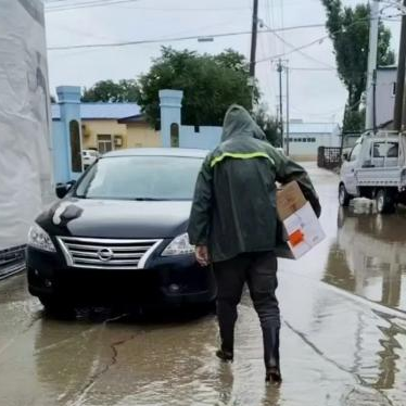 在积水严重的地区,配送车辆无法通行,物流人员就蹚水前行,他们身着雨衣,在湍急的水流中缓缓前行,将一箱箱药品安全送达医院。
