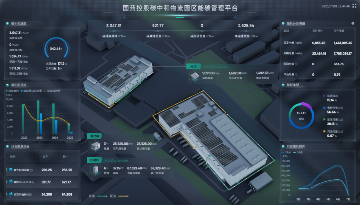 国药物流构建了涵盖碳盘查、碳管理、碳减排、碳抵消、碳交易及零碳认证的全流程碳中和解决方案。通过能碳管理平台实施针对性减排措施,并购买碳汇及绿电/绿证实现净零排放,成功获得ISO 14068和PAS 2060碳中和认证。同时,园区能碳管理平台确保碳排放与减排数据可追溯、可审计,支持在线完成年度核查与认证,标志着园区零碳运营迈入规范化、常态化的新阶段。