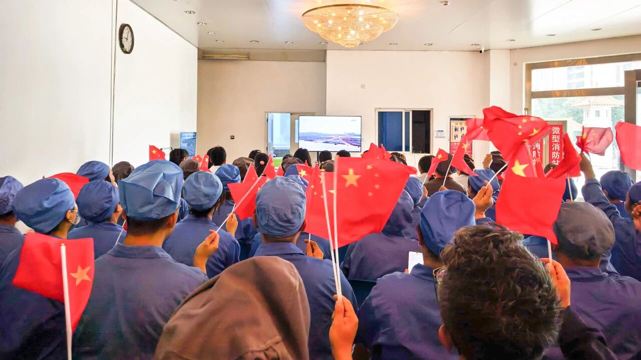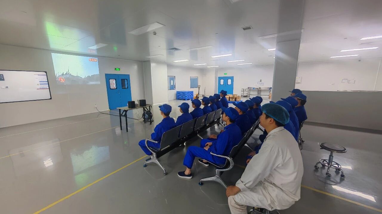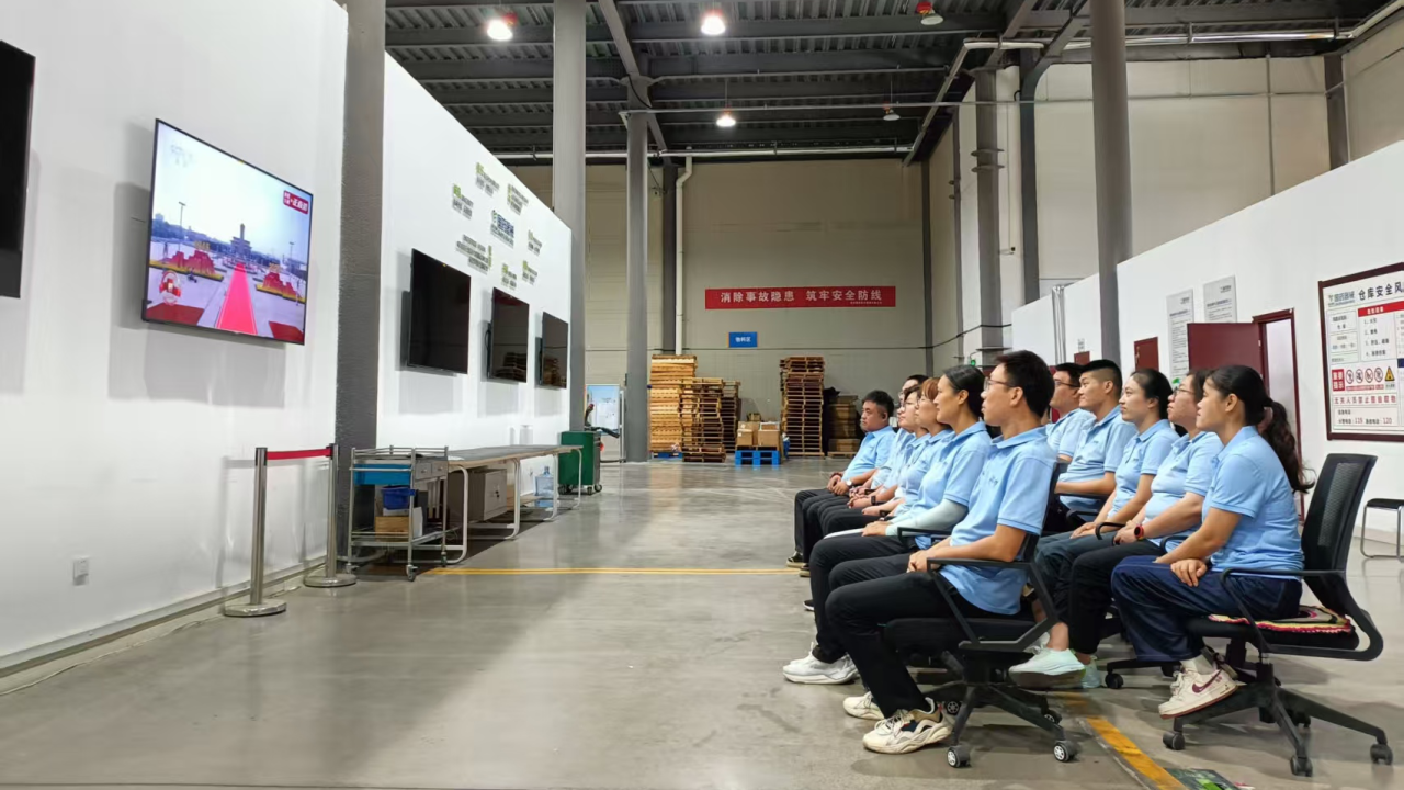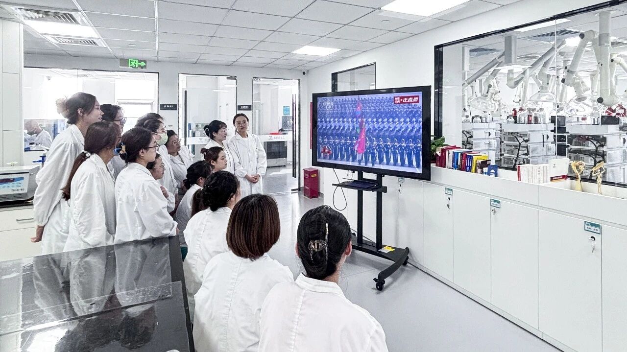 在广东深圳,国药致君粉针二车间收看大会盛况