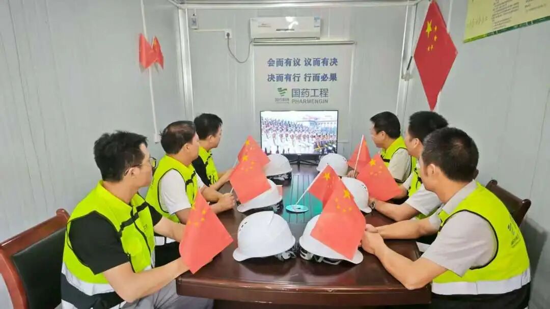在贵州贵阳,国药工程贵州同济堂项目团队收看大会盛况