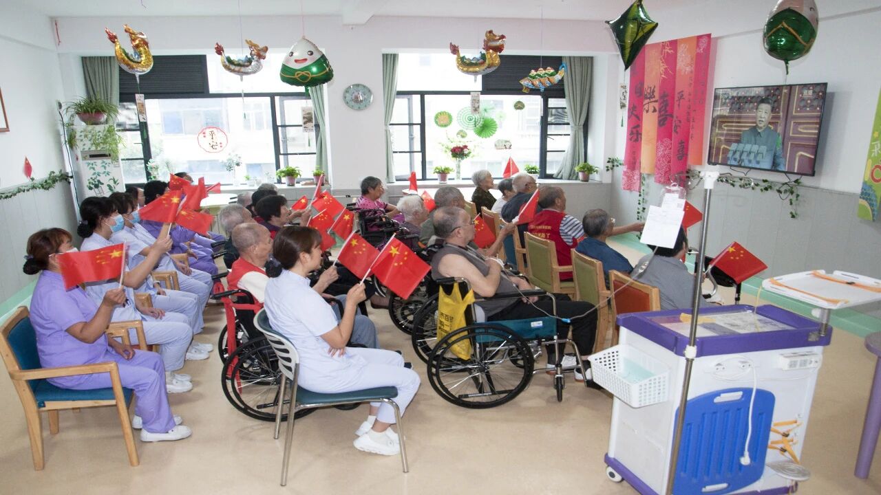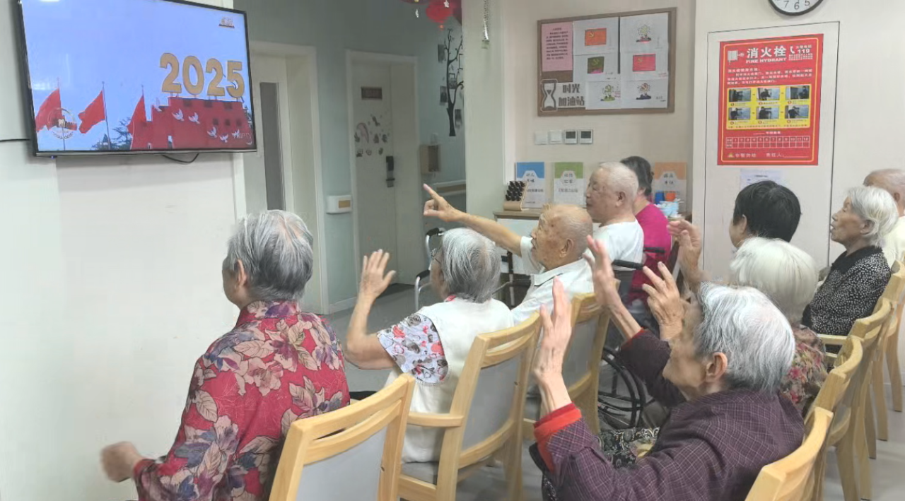 在山东青岛,国药康养青岛颐养中心在住长者收看大会盛况