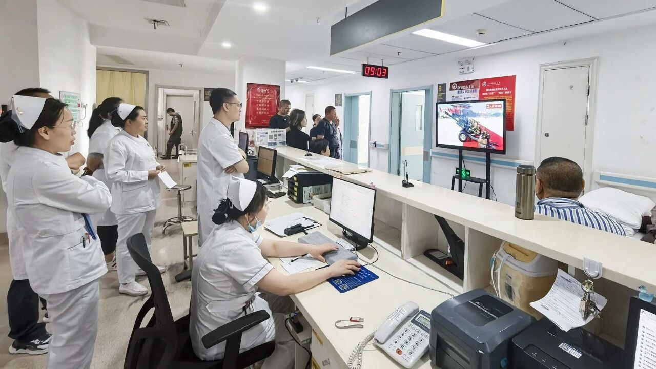 在山西大同,国药同煤总医院患者家属及医护人员一起收看大会盛况