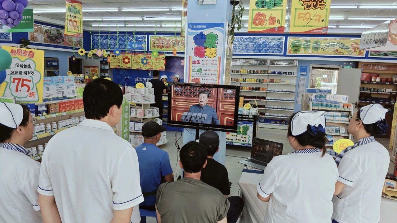 在辽宁盘锦,成大方圆盘锦地区中心店群众与职工一起收看大会盛况