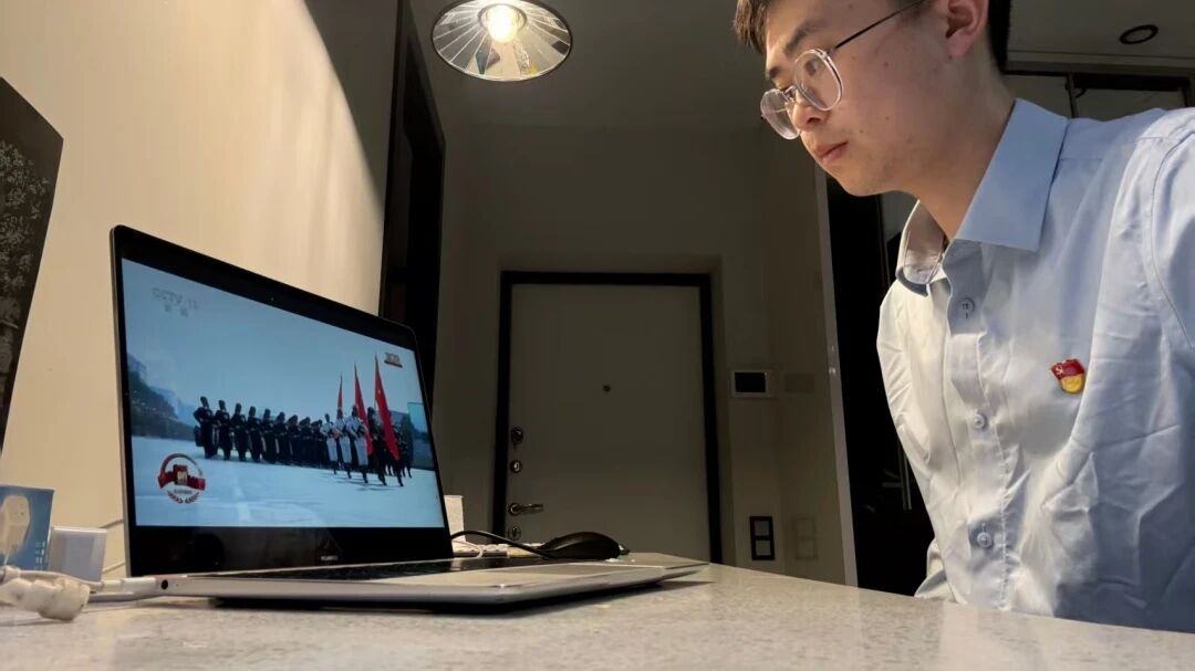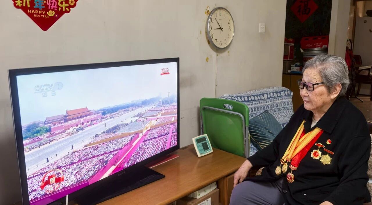 在北京,抗战胜利80周年纪念章获得者、抗战老战士、离休干部矫惠书收看大会盛况
