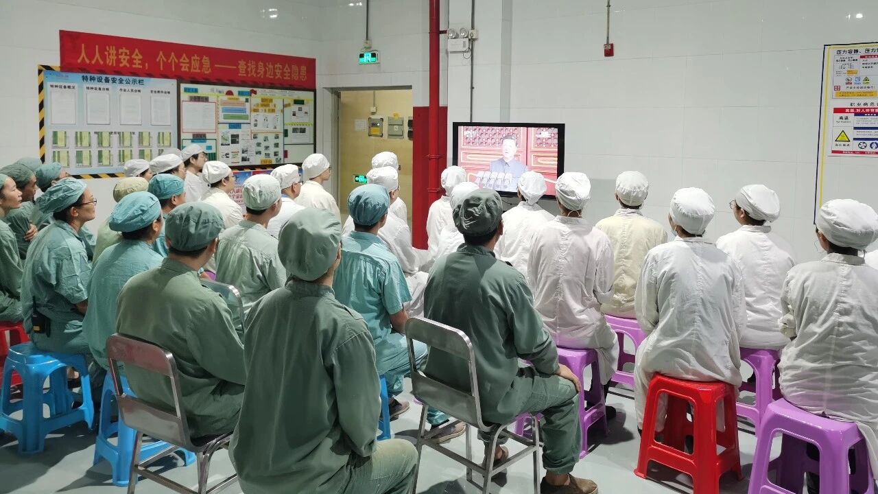 在广东佛山,国药集团德众(佛山)药业有限公司高明分公司车间职工收看大会盛况