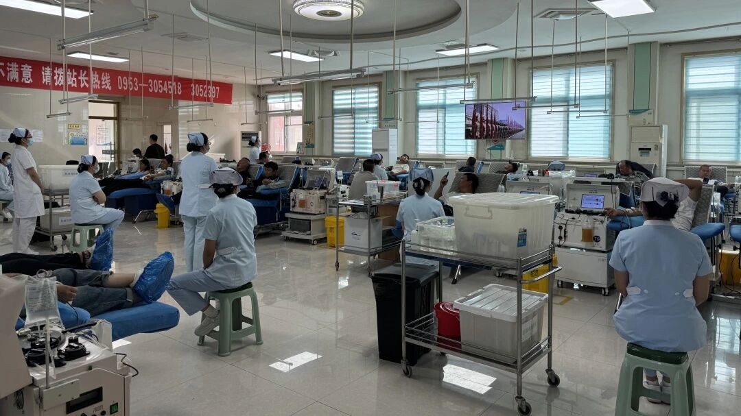 在宁夏青铜峡,天坛生物青铜峡浆站献血浆者与职工一起收看大会盛况