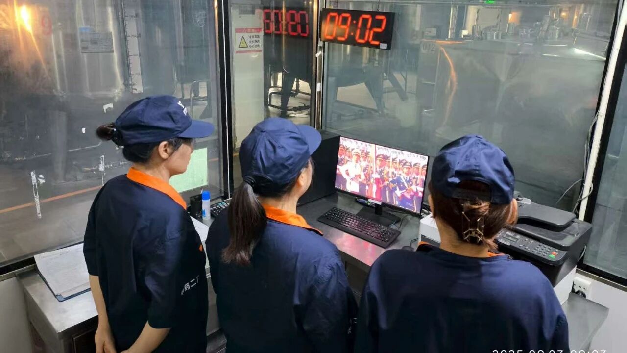 在江西南昌,江西一方天江药业有限公司配方颗粒车间职工收看大会盛况
