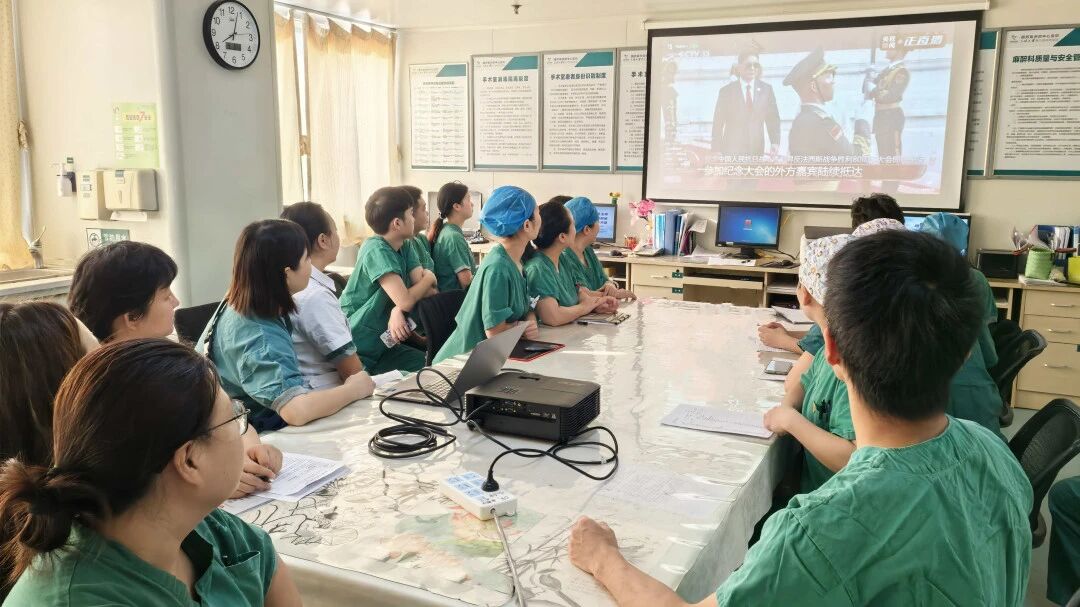 在湖北宜昌,国药葛洲坝中心医院麻醉科(手术室)医护人员收看大会盛况
