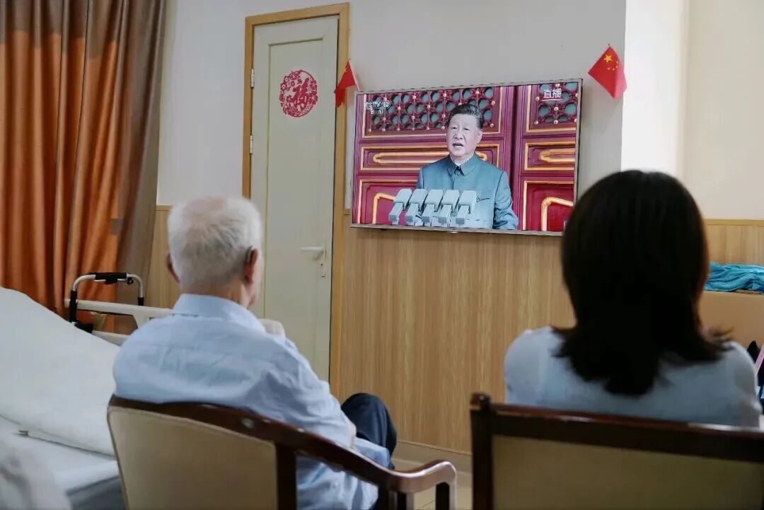 观礼时虞老凝视屏幕时那专注而深邃的目光,仿佛穿越了八十载峥嵘岁月,与天安门广场上的铁流荣光再次交汇。他嘴角噙着的笑意里,既有对往昔烽火岁月的铭记,更有对今日国盛军强的由衷欣慰与自豪。作为新时代的国药人,大家也从虞老这位抗战亲历者的亲诉中,真切读懂了“苦难辉煌” 的厚重,深刻理解了“薪火相传”的意义。